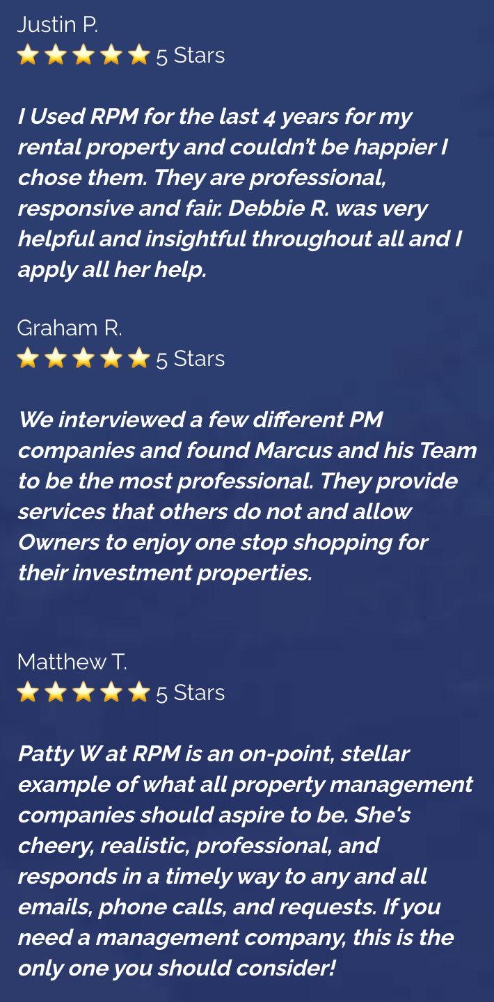 I Used RPM for the last 4 years for my rental property and couldn’t be happier I chose them. They are professional, responsive and fair. Debbie R. was very helpful and insightful throughout all and I apply all her help.